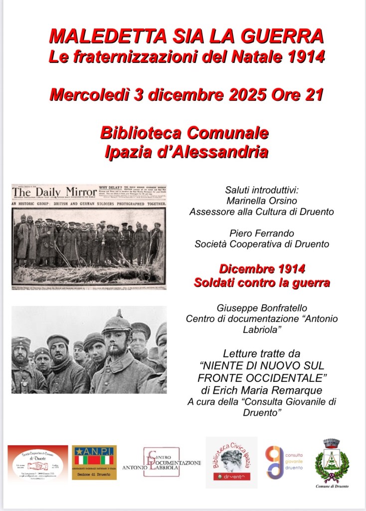 Cari amici, segnaliamo un’importante iniziativa storico/culturale organizzata dall’Amministrazione comunale e dalla Società cooperativa di consumo di Druento, presso la biblioteca civica Ipazia d’Alessandria alle ore 21 di mercoledì 3 dicembre, tra soldati nemici sul fronte francese nel Natale 1914.