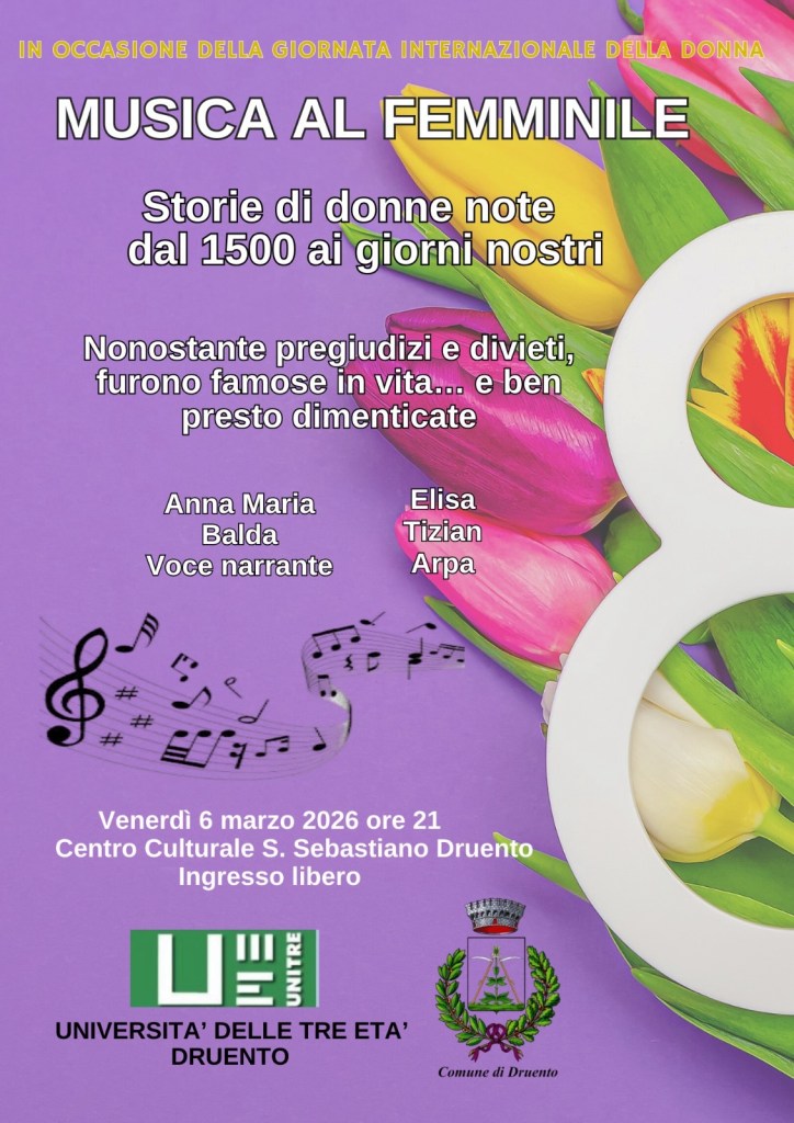 In occasione dell’ 8 marzo, Giornata Internazionale della Donna, l’Amministrazione Comunale di Druento e Unitre Druento hanno organizzato queste importanti serate di Cultura, Musica e Festa.